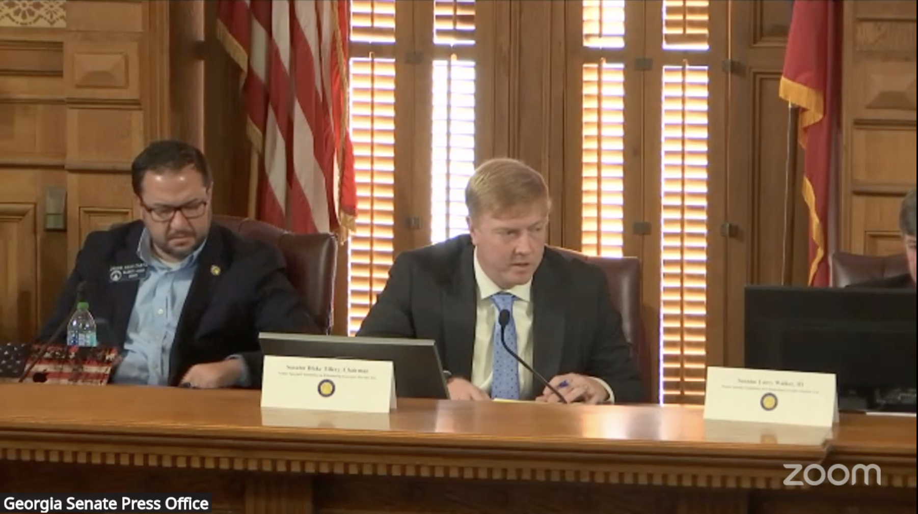 State Sen. Blake Tillery, chairman of the special committee for eliminating the state's income tax, thanks Dr. Arthur B. Laffer for testifying at the meeting on Nov. 17. Sen. Jason Anavitarte sits to the left of Tillery. Credit: Georgia Senate Press Office livestream